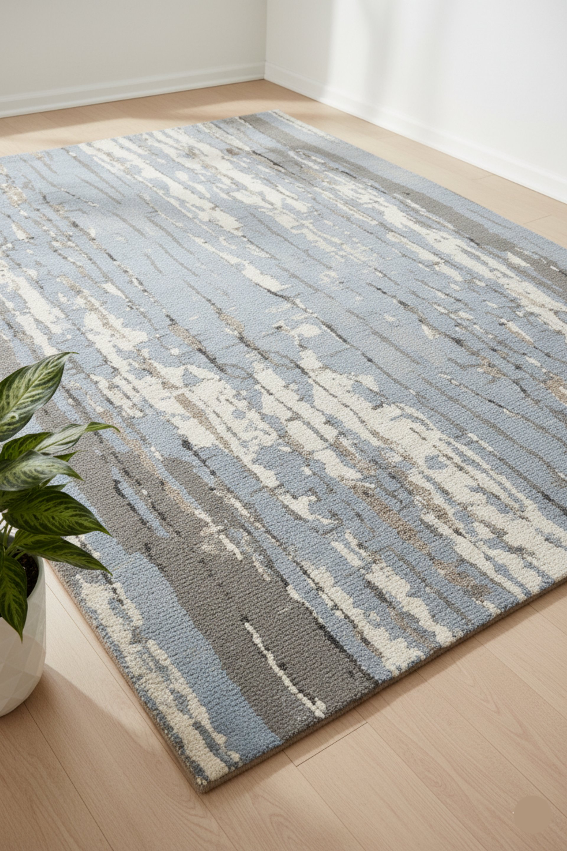 The Canophon rug is a standout among our textured custom rugs, featuring a weathered, organic abstract design that evokes the rugged texture of peeling paint or distressed tree bark. Its cool slate-blue and silver-gray palette is accented by vertical fissures and "eroded" patches of cream and tan, creating a sense of antique industrial depth. Crafted with a high-quality 100-knot construction, it captures intricate flaked details with sharp, photorealistic clarity. This sophisticated, distressed design provides a versatile and tactile foundation that bridges raw natural elements with modern urban interiors.