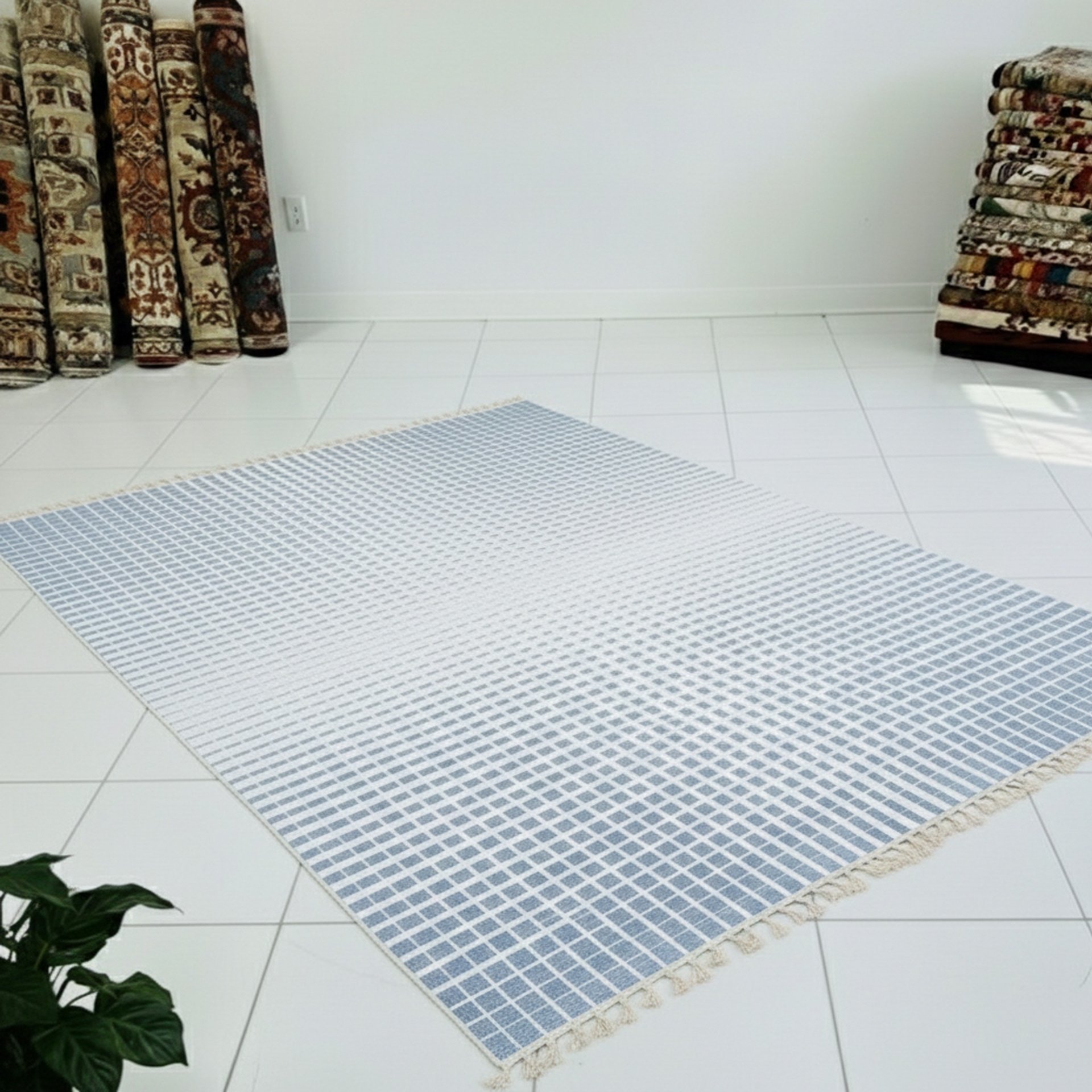 The Grid 5 rug is a standout among our innovative custom rugs, featuring a mesmerizing gradient optical illusion composed of thousands of tiny blue pixel-like squares on a crisp white base. These squares gradually decrease in scale and density toward the center, forming a glowing, cross-shaped focal point that adds three-dimensional depth. Its precise geometric layout is softened by a soothing blue-and-white palette, creating a design that feels both high-tech and tranquil. The 100-knot construction ensures every tiny square is rendered with sharp, professional clarity, perfect for contemporary, minimalist spaces.