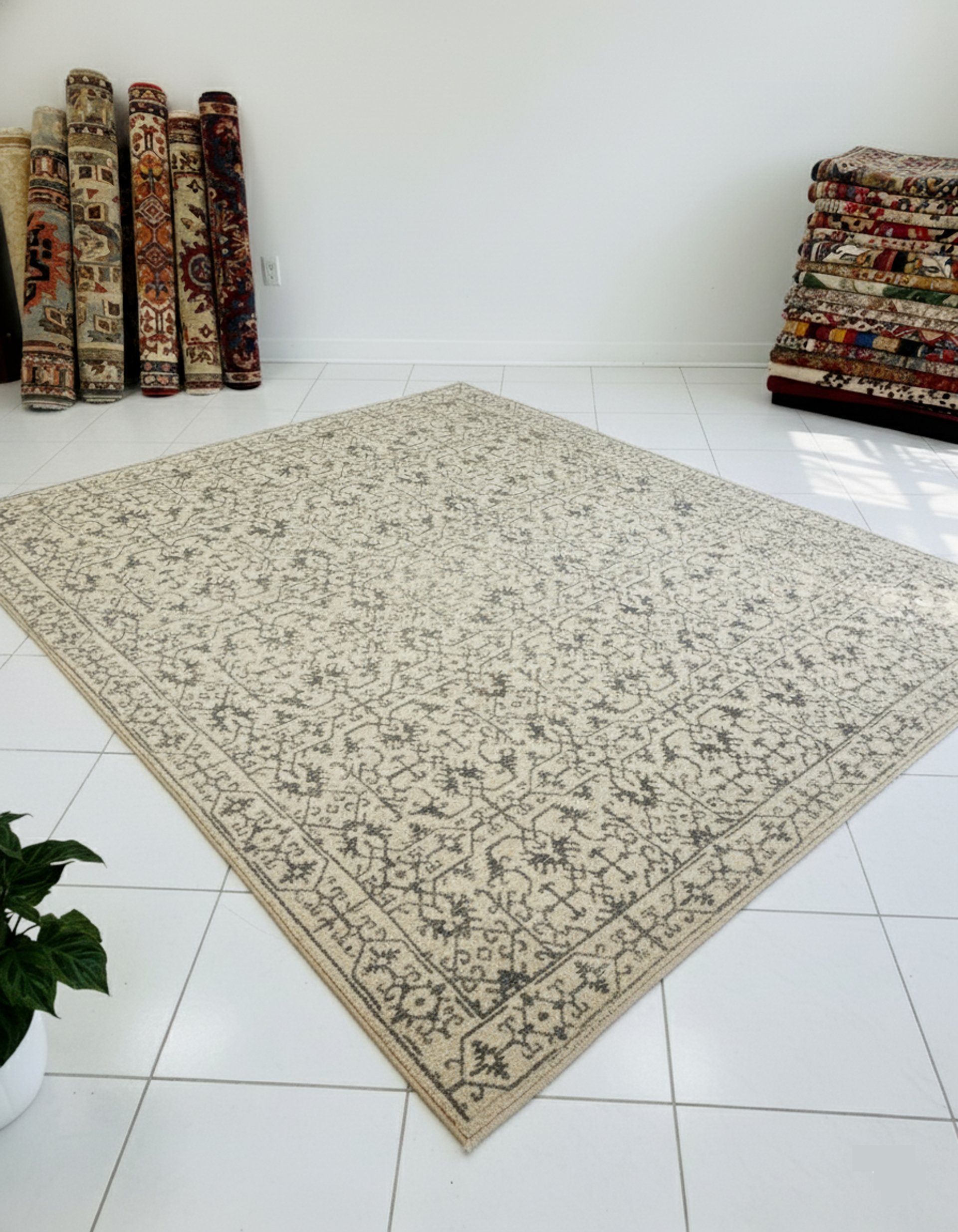 The Lanu rug is a standout among our exquisite custom rugs, featuring a classic, symmetrical composition with a dense all-over pattern of intricate geometric and tribal-inspired motifs. Framed by a delicate matching border of repeating diamond and linear elements, the design grounds the busy central field. Its understated charcoal-grey on warm cream palette offers a timeless, traditional aesthetic that complements a variety of interior styles. The fine 100-knot weave ensures a crisp, detailed finish, highlighting the precision of the interlocking shapes and the balanced, rhythmic layout.