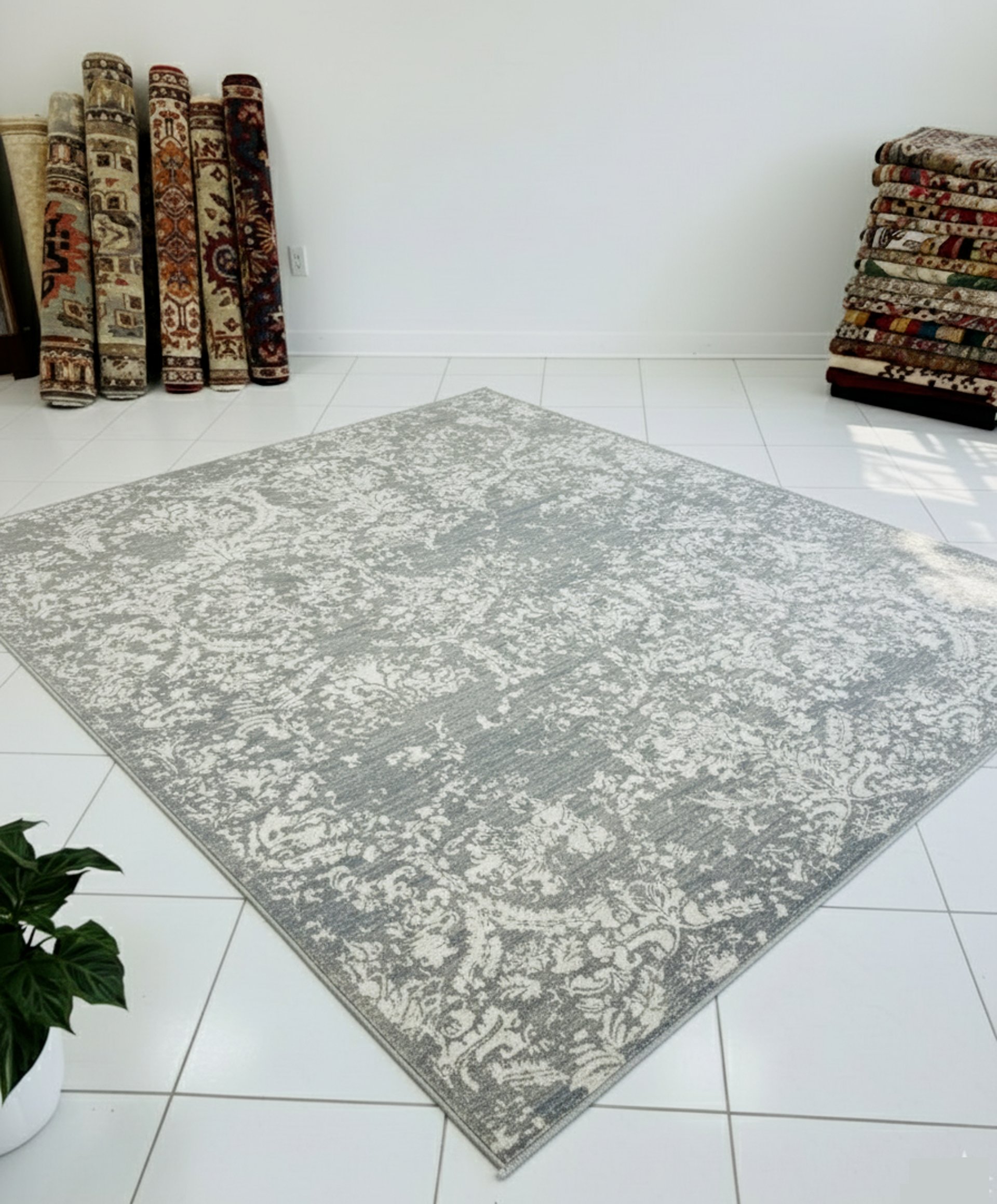 The Losa rug is a standout among our luxurious custom rugs, showcasing a distressed damask pattern in ivory and soft white for a weathered, vintage-inspired aesthetic. Its ornate botanical motifs sit against a mottled grey and slate background, offering a subtle tonal contrast that feels both aged and modern. The erased-effect design softens traditional symmetry, giving the rug a unique, high-end "shabby chic" character, while the fine, dense weave provides a sophisticated texture that balances classical elegance with a contemporary, lived-in feel.