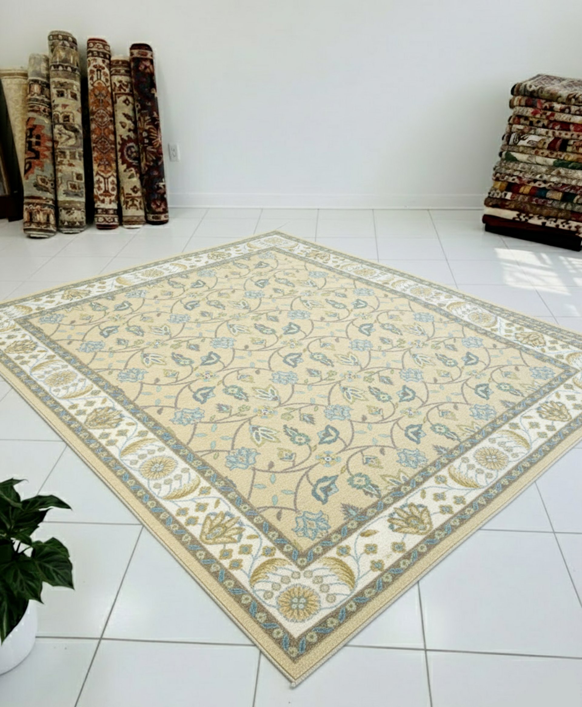 The Norsa rug is a standout among our luxurious custom rugs, featuring a vibrant, traditional composition with a rhythmic all-over pattern of graceful, interlocking botanical vines and delicate floral blossoms. The central field is framed by a multi-layered border showcasing larger ornate floral medallions and intricate leaf motifs in a harmonious repeating sequence. Its elegant color palette blends a warm golden-beige background with accents of sky blue, sage green, and soft ivory, creating a classic and inviting aesthetic. The fine 100-knot weave provides a premium, high-definition finish that captures the fluid movement of the linework and the sophisticated interplay of natural tones.