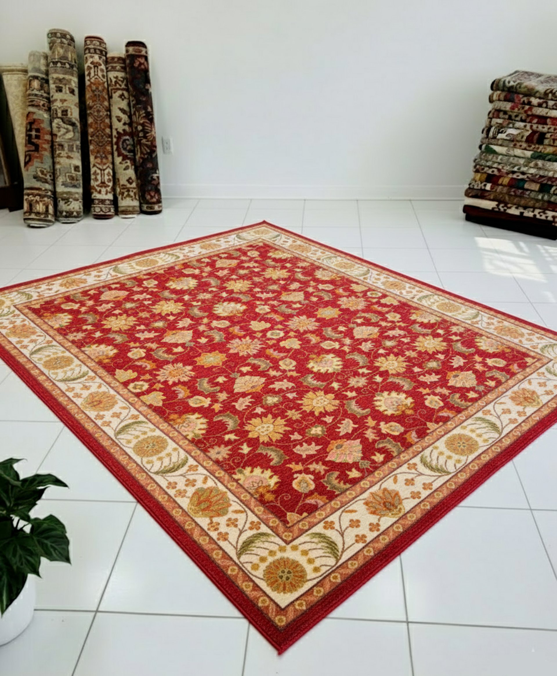The Porsa rug is a standout among our exquisite custom rugs, featuring a rich, traditional composition with a dense all-over pattern of intricate floral medallions and gracefully interlocking botanical vines. Framed by a luxurious multi-layered border that echoes the central field’s ornate floral motifs and delicate leaf patterns in a rhythmic sequence, its bold crimson-red background is accented by vibrant tones of gold, sage green, and soft ivory. The fine 100-knot weave ensures a high-definition finish, capturing the sophisticated detail and fluid linework of its classic, historical aesthetic.