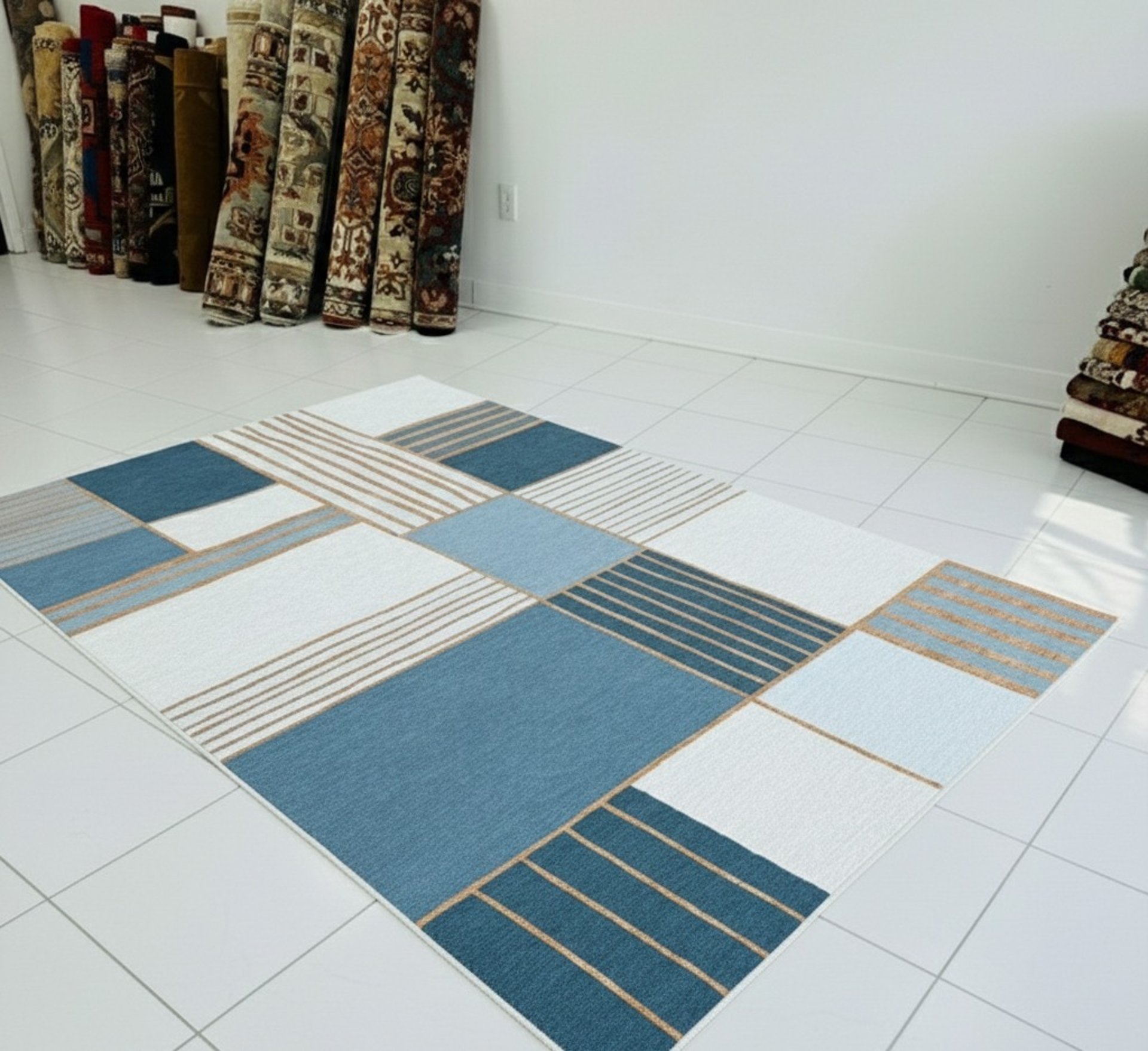 The Village rug is a standout among our artistic custom rugs, featuring a sophisticated asymmetrical grid of rectangular blocks in deep teal, powder blue, and off-white. High-contrast copper-toned linework cuts through the design in alternating horizontal and vertical patterns, giving it a handcrafted, mid-century abstract feel. The 100-knot construction provides a dense, fine texture that highlights the sketchy, organic quality of the metallic accents. Its structural yet airy composition makes it a versatile piece of functional textile art for modern interiors.