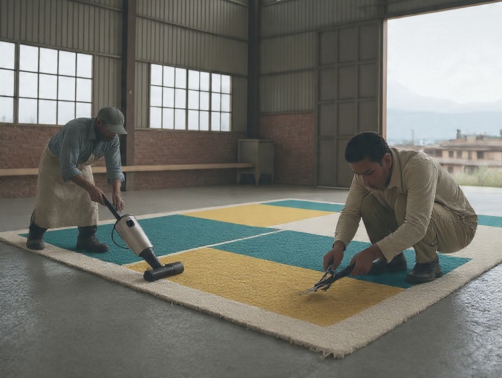 Refinement, Binding and Polish: After trimming, the rug’s edges are firmly bound to prevent fraying and ensure long-lasting strength. It is then thoroughly vacuum cleaned to remove fine dust and fibers, enhancing its natural sheen and softness. Every section is inspected for color uniformity, balanced pile height, and flawless texture, ensuring both visual and tactile perfection.